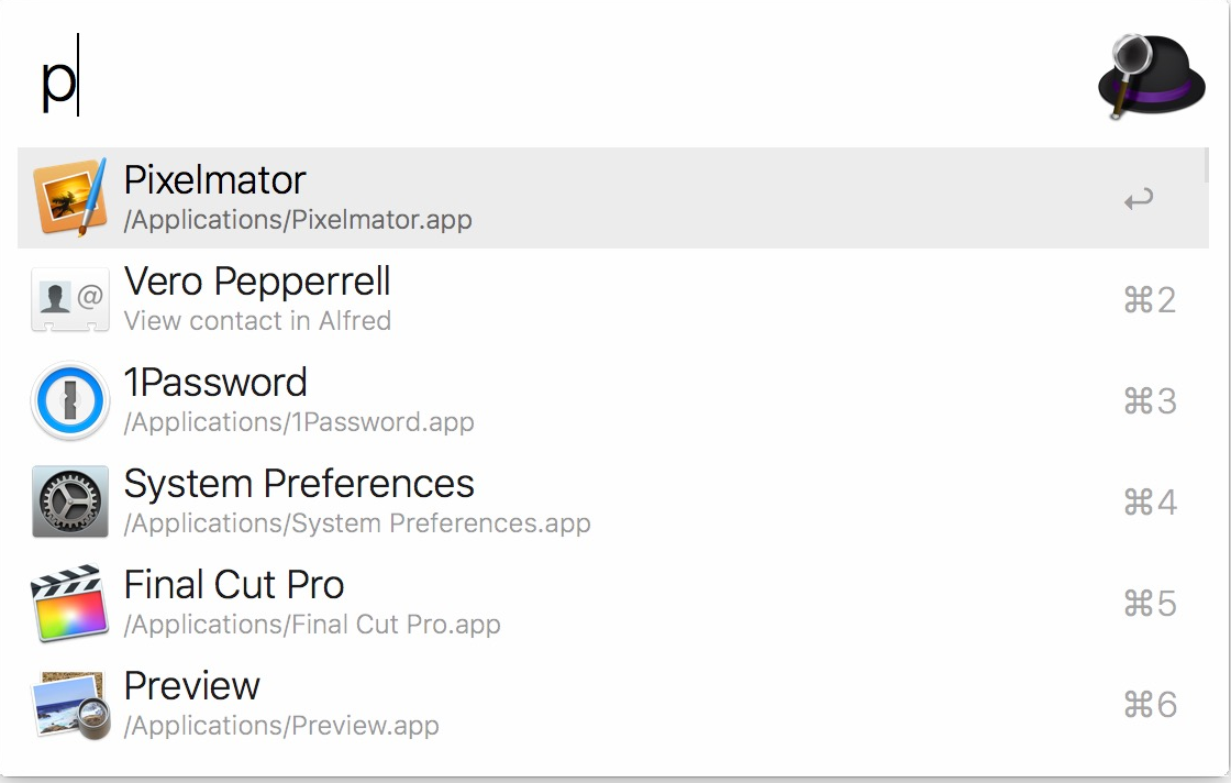 このアプリをインストールしてからDock(アプリを起動できるバー)を使う機会が激減しました。いわゆるランチャーアプリです。が、極限までに洗練されています。使い方はシンプルです。予め設定したショートカットキーで呼び出します。自分の場合は「Control + A」で呼び出せる設定にしています。次のような入力窓が画面上に表示されます。